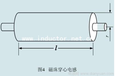 穿心電感的電感量一般都比較小,大約在幾微亨到幾十微亨之間,電感量大小與穿心電感中導線的大小以及長度,還有磁珠的截面積都有關系,但與磁珠電感量關系最大的還要算磁珠的相對導磁率 。圖3、圖4是分別是指導線和穿心電感的原理圖,計算穿心電感時,首先要計算一根圓截面直導線的電感,然后計算結果乘上磁珠相對導磁率 就可以求出穿心電感的電感量。
