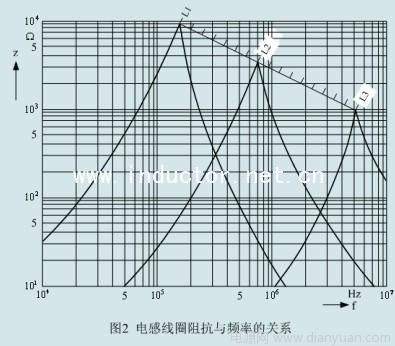 圖2是普通電感線圈的阻抗與頻率的關系圖,由圖中可以看出,電感線圈的阻抗開始的時候是隨著頻率升高而增大的,但當它的阻抗增大到最大值以后,阻抗 反而隨著頻率升高而迅速下降,這是因為并聯(lián)分布電容的作用。當阻抗增到最大值的地方,就是電感線圈的分布電容與等效電感產(chǎn)生并聯(lián)諧振的地方。圖中,L1 > L2 > L3,由此可知電感線圈的電感量越大,其諧振頻率就越低。從圖2中可以看出,如果要對頻率為1MHz的干擾信號進行抑制,選用L1倒不如選用L3,因為 L3的電感量要比L1小十幾倍,因此L3的成本也要比L1低很多。